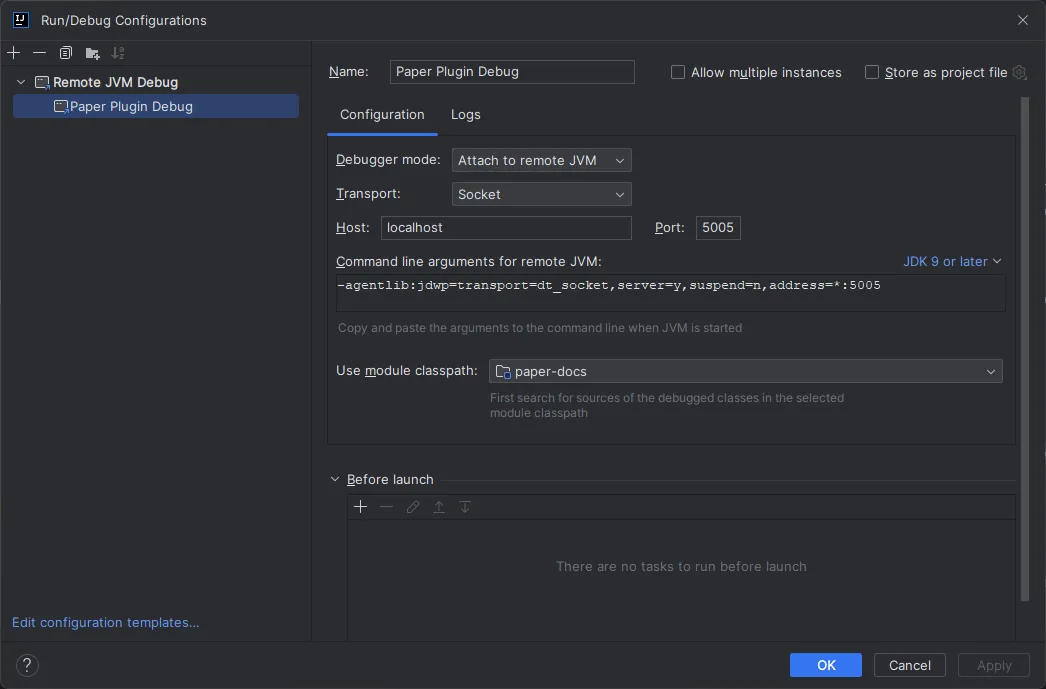 java -agentlib:jdwp=transport=dt_socket,server=y,suspend=n,address=*:5005 -jar paper-1.21.11.jar nogui
